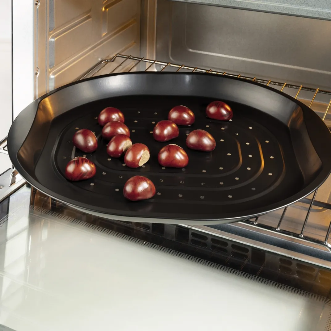Avec cette plaque spéciale, dont les nervures et les perforations permettent à la chaleur de circuler parfaitement, vous préparez de délicieuses châtaignes au four, en quelques minutes seulement ! Cette plaque est idéale aussi pour cuire des frites au four…