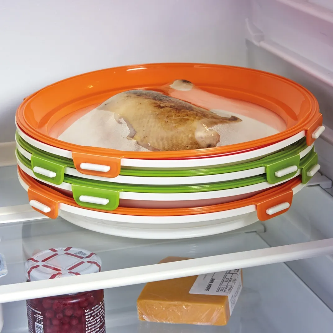 Ces 2 plats sont dotés d’un film très souple et résistant en leur centre pour s’adapter parfaitement à la forme des aliments à conserver. Fini le film étirable et l’aluminium : vous n’avez plus qu’à placer les denrées que vous souhaitez garder dans les plateaux, les empiler pour un gain de place au réfrigérateur ! Et évidemment, ils sont réutilisables à volonté !