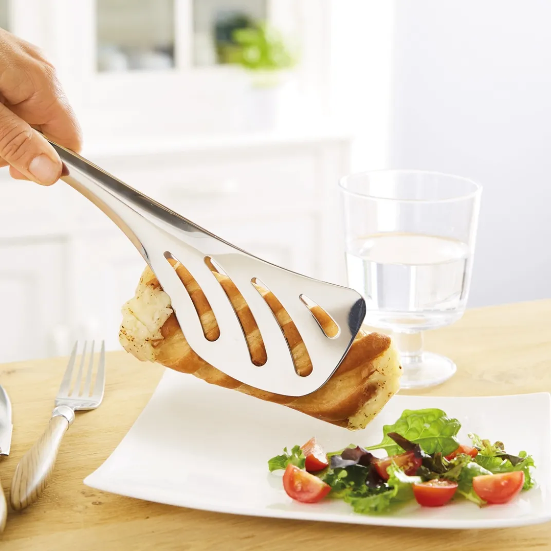 Utile en toute circonstance à la cuisine (retourner ou saisir les aliments sans se brûler, sans les abîmer), cette pince permet aussi de faire le service sans toucher les aliments !