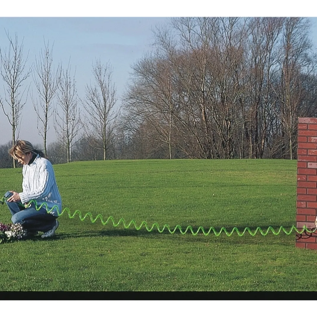 Devoir dérouler le tuyau de jardin chaque fois qu’on s’en sert, puis le ranger, c’est lassant et le laisser traîner en désordre, ce n’est pas mieux ! En forme de ressort, ce tuyau s’allonge à la demande, pour arroser les plates-bandes, les jardinières, ou laver la voiture… le travail fait, il revient tout seul à sa forme compacte et se range dans le minimum de place.