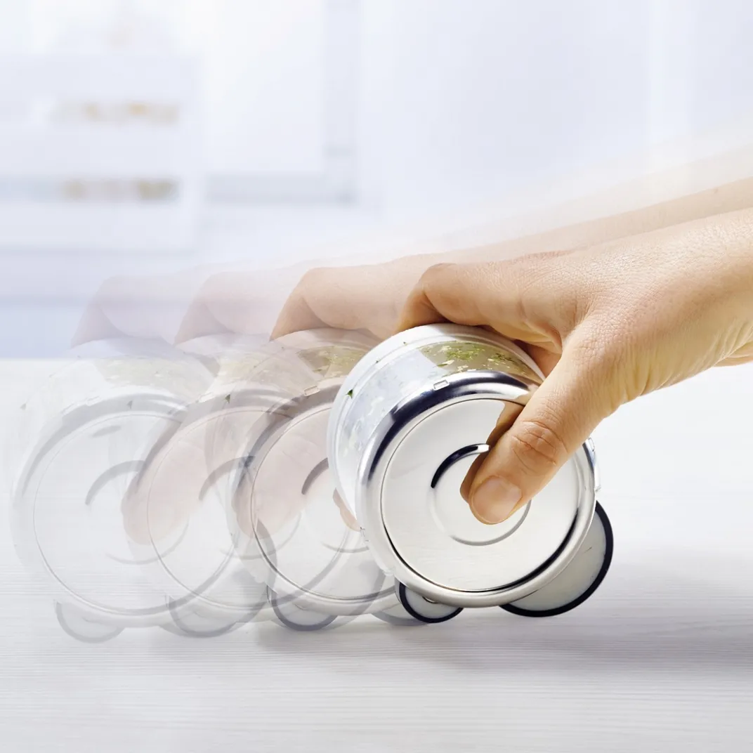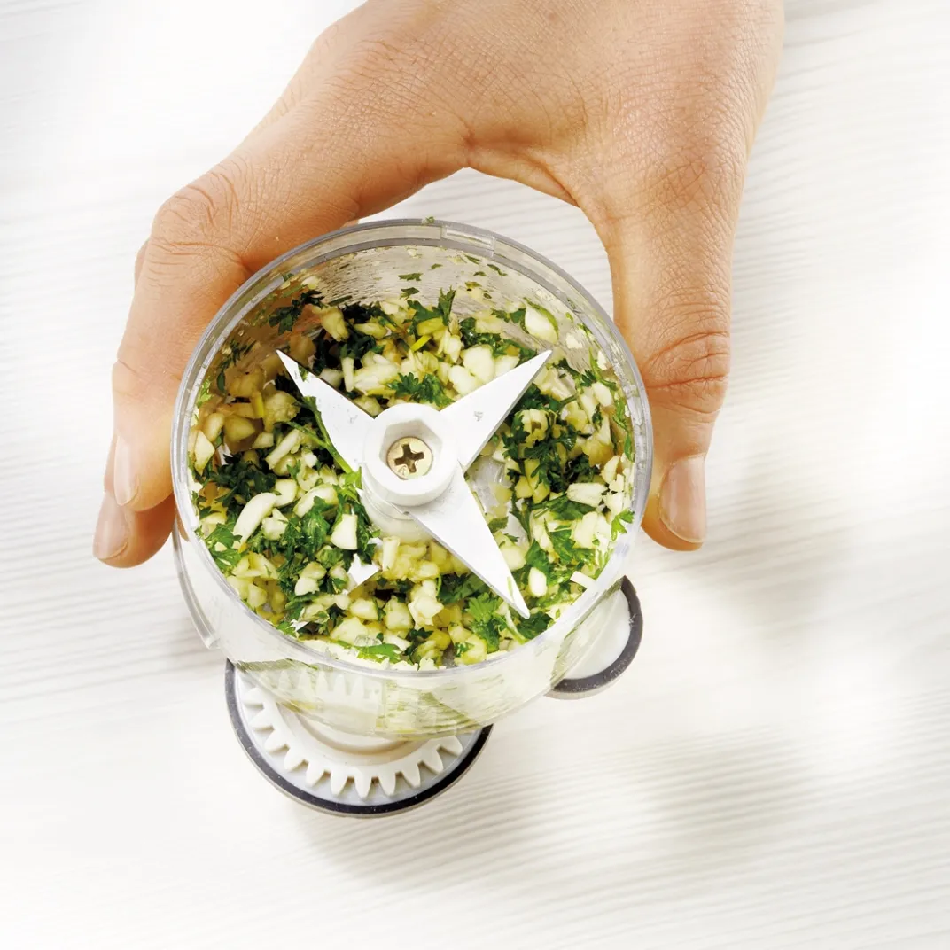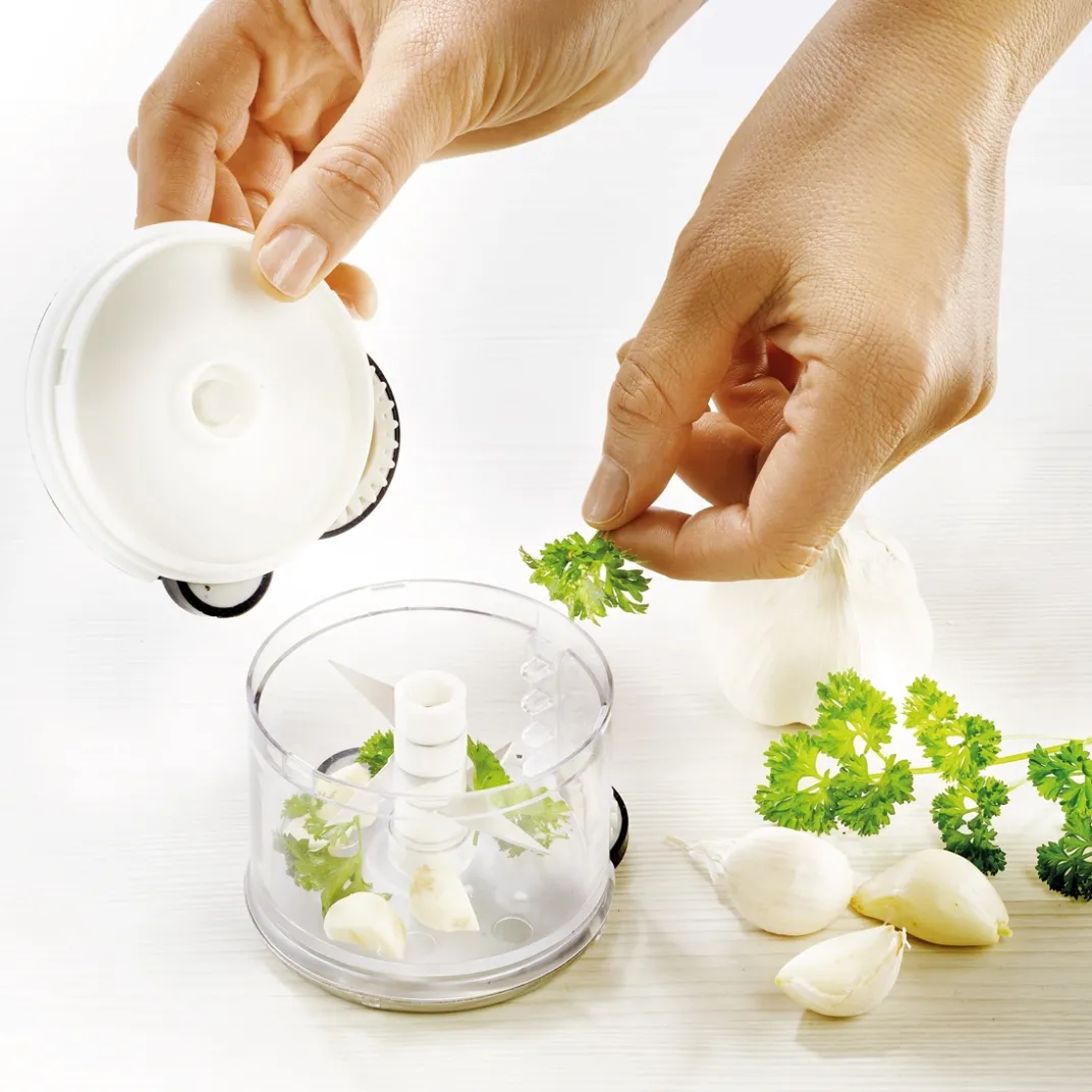 Remplissez-le d’ail, d’échalotes, de persil ou de fromage, faites-le rouler sur le plan de travail : le mécanisme actionnera les 3 lames tranchantes et vos aliments seront finement émincés, sans efforts et sans laisser la moindre odeur sur vos doigts !