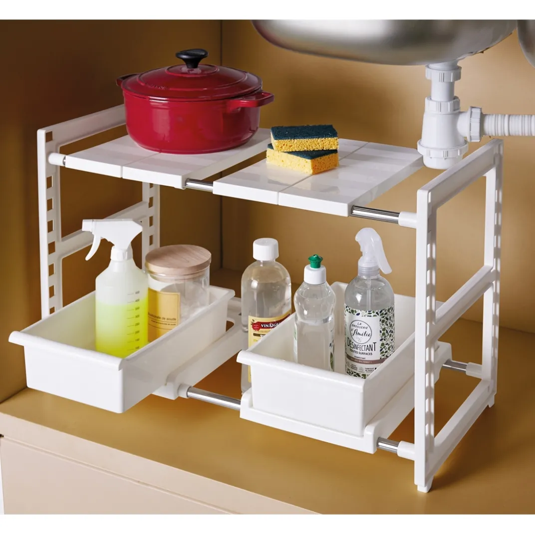 Extensible, elle s’adapte à la longueur de votre meuble et offre en prime, 2 tiroirs bien pratiques. La hauteur des étagères est réglable.